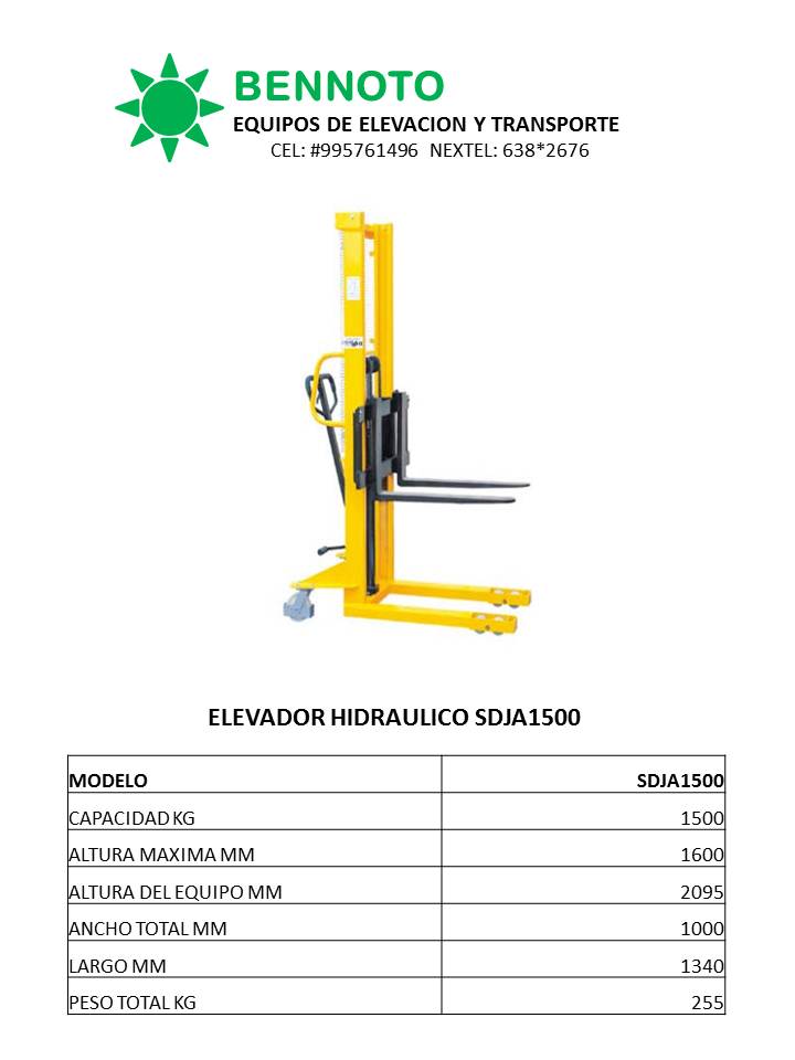 Apilador hidráulico marca Bennoto capacidad 1500 KG , uñas de acero forjado.