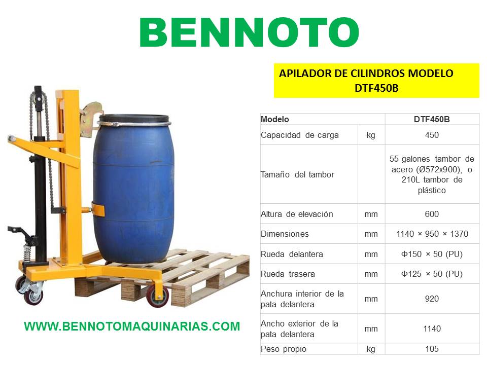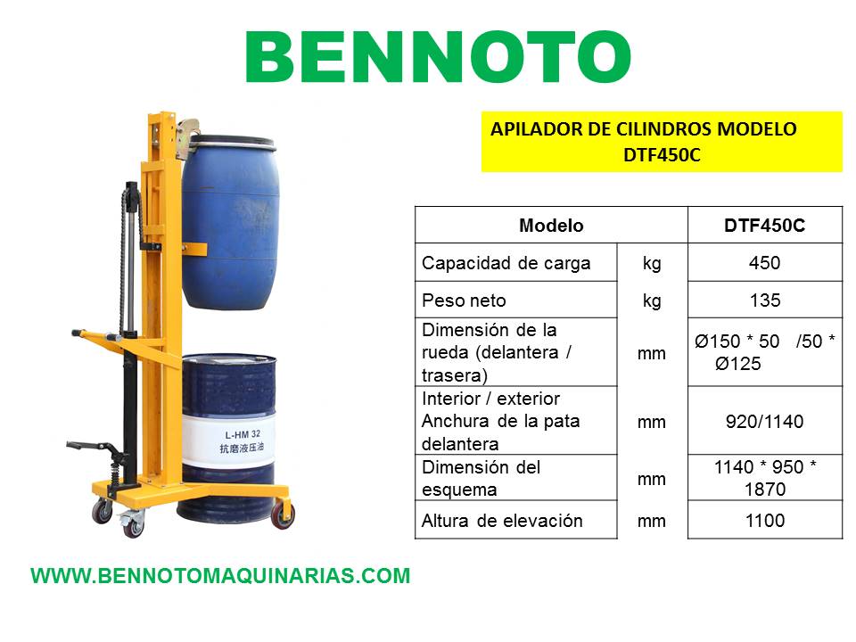 Elevador de cilindros marca Bennoto capacidad 450 kg elevación 1100 mm .
