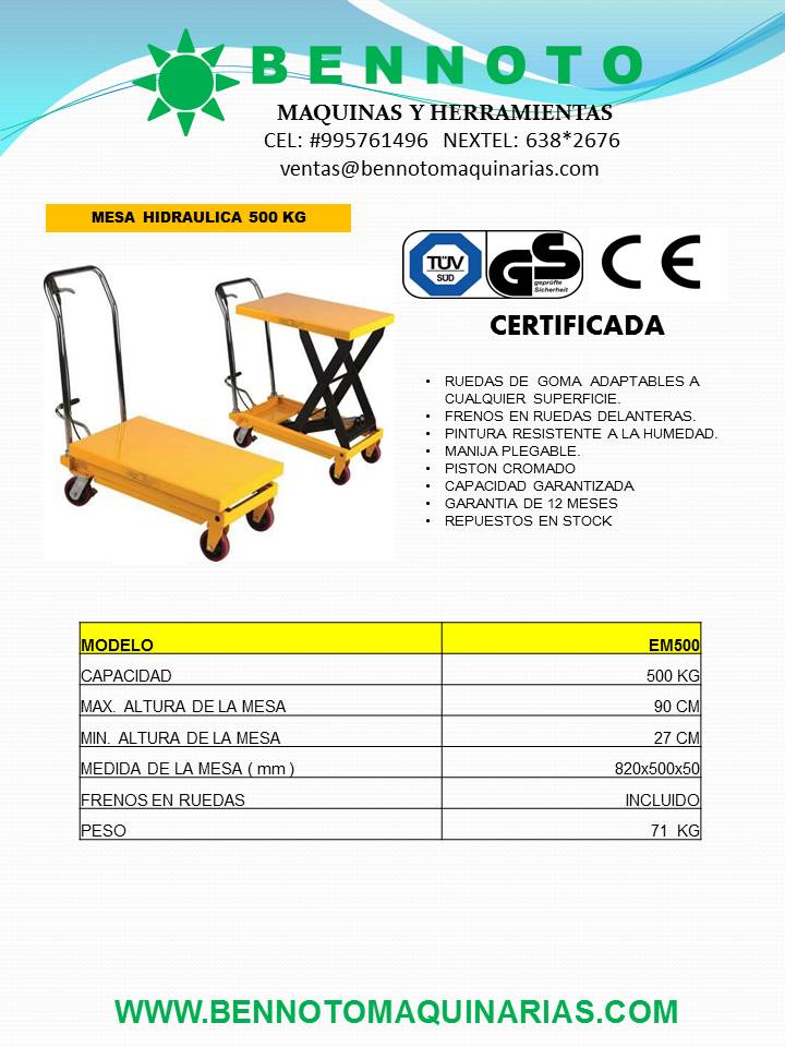 Mesa hidráulica manual marca Bennoto capacidad 500 kg elevación 90 cm.