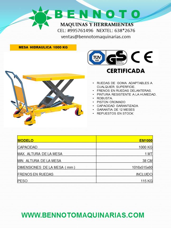 Mesa hidráulica manual marca Bennoto capacidad 1000 kg elevación 1 metro.