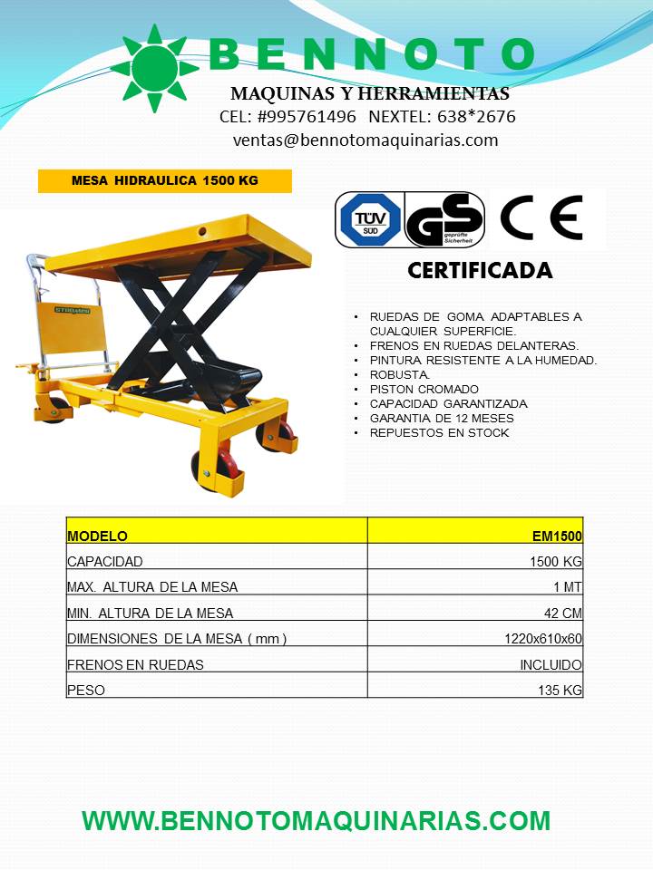 Mesa hidráulica manual marca Bennoto capacidad 1500 kg elevación 1 metro.