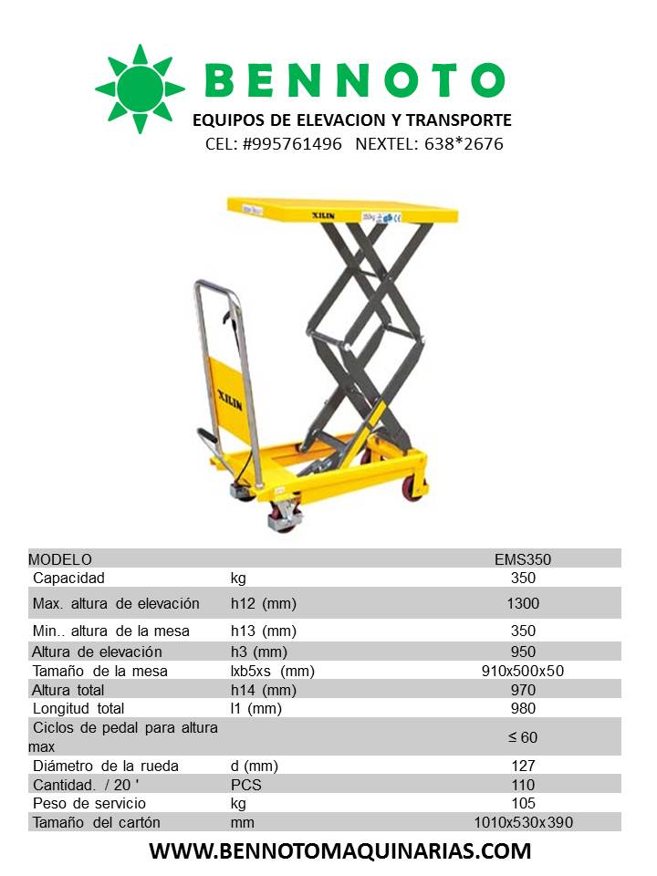 Mesa hidráulica manual doble tijera marca Bennoto capacidad 350 Kg / 1.3 metros.