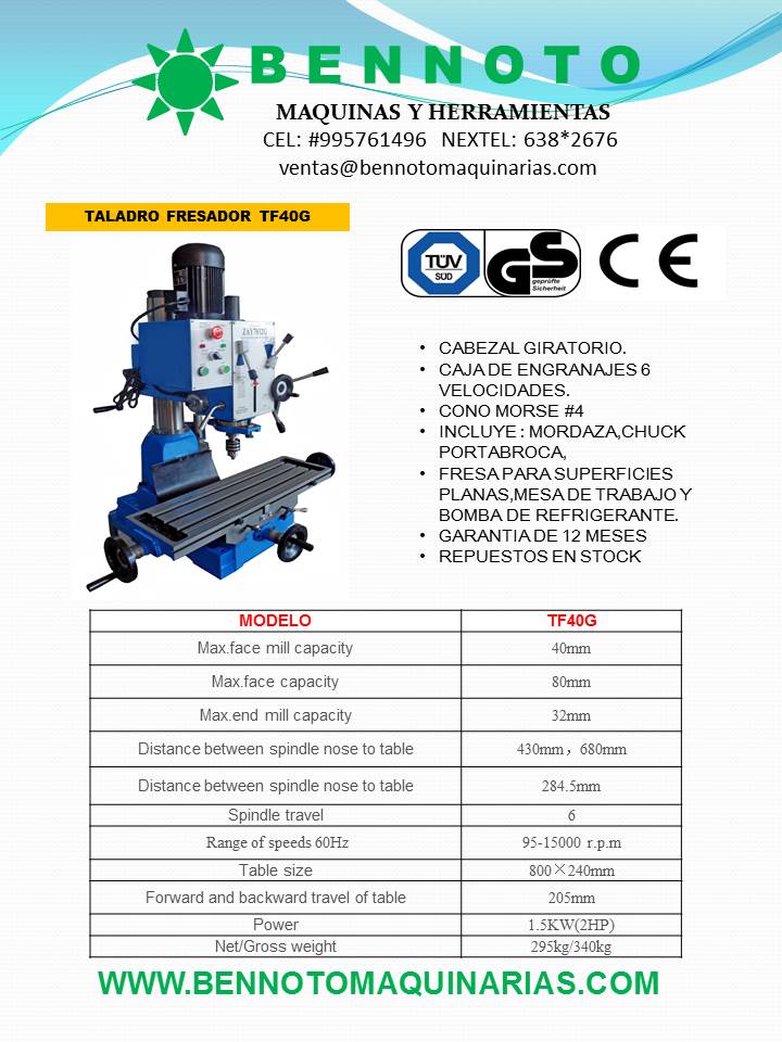 Venta de taladros fresadores Bennoto 40 mm cono morse #4 incluye accesorios.